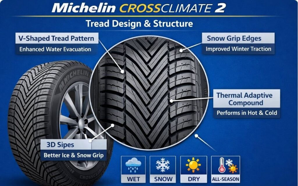 That is what sets it apart from many regular all-season tires. A standard all-season tire is usually fine for everyday driving, but it can lose confidence when the weather turns rough. The CrossClimate 2 is designed to stay useful in more conditions, especially when temperatures drop and roads get wet or snowy.
